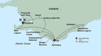 Travel to Jökulsárlón glacial lagoon, filled with floating icebergs. Explore this extraordinary landscape and search for seals swimming in cold waters. Travel to Skaftafell, gateway to Vatnajökull National Park, the largest national park in Europe. Vatnajökull is known for having Iceland’s highest mountains and Europe's largest glacier.