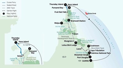 Observe the towering termite mounds of Bramwell Junction before continuing on with your adventure. Stop at Fruit Bat Falls and cool off with a refreshing swim in the pristine waters of the Elliott River. Cross Jardine River by ferry, then skirt Jardine River National Park and continue through the traditional land of the Injinoo Indigenous people.