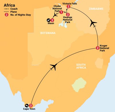 ✓ Internal flights from Cape Town to Kruger National Park, Kruger National Park to Victoria Falls and Kasane to Maun