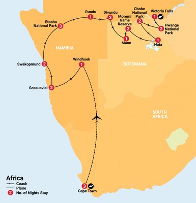 ✓ Internal flight from Cape Town in South Africa to Windhoek in Namibia