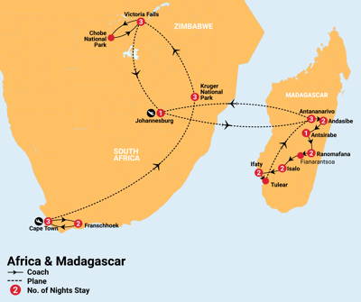 ✓ Internal flights from Cape Town to Kruger, Kruger to Victoria Falls, Victoria Falls to Johannesburg, return Johannesburg to Antananarivo and from Tulear to Antananarivo