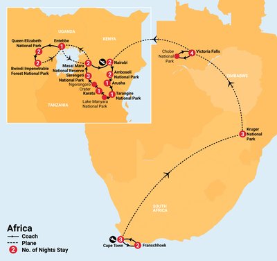 ✓ Internal flights from Cape Town to Kruger, Kruger to Victoria Falls, Victoria Falls to Nairobi, Nairobi to Entebbe, Bwindi to Entebbe, and Entebbe to Nairobi