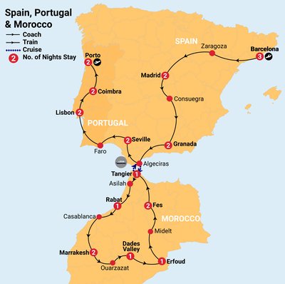 This tour spans Spain, Morocco, and Portugal, traveling by private coach, ferry, and train. You'll journey by ferry between Spain and Morocco, take a train from Barcelona to Madrid, and travel by rail from Lisbon to Coimbra and Porto. Your train documentation will be given to you on tour by your local representative. Your train ride will be unescorted, however a local representative will assist you on either end to ensure that your journey is trouble free. For some coach journeys, where applicable there will be comfort stops along the way where you can freshen up, stretch your legs, use the bathroom and often, purchase refreshments. Generally, lunch stops will be taken at rest stops as they can easily accommodate our large groups.