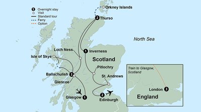 Begin your day with a visit to a family-run farm set in the heart of the Highlands. See sheepdogs at work while surrounded by the mountain wilderness of Cairngorms National Park. Continue on to the vibrant Victorian town of Pitlochry for some time at leisure before traveling to St. Andrews, the beautiful town in the Kingdom of Fife that gave the world the game of golf. See the Royal and Ancient Clubhouse and the famous Old Course. End your day in Scotland’s capital city of Edinburgh.