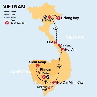 ✓ Embark in a 14 day grassroots exploration of Vietnam & Cambodia with incredible sightseeing including an overnight cruise in Halong Bay and guided tours of Hanoi, Hue, Hoi An, Ho Chi Minh City, the Mekong Delta, the Angkor Wat Temples and Phnom Penh