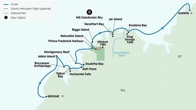 Your expedition ship arrives at Prince Frederick Harbour today, home to soaring red cliffs and mangroves. With its extreme tides and pristine ecosystems, the harbour is home to a wide variety of wildlife, including saltwater crocodiles and mudskippers. Keen birdwatchers should keep an eye out for kingfishers, egrets, herons and white-bellied sea eagles. It's time to jump aboard your Zodiac vessels for an exploration of the Hunter River and Naturalist Island. As your day of discovery draws to a close, you might choose to set out on a helicopter flight and view the natural spectacle of Mitchell Falls from above (own expense).