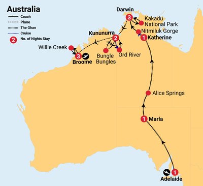 On arrival into Darwin, you will be transferred to a central location in Darwin. From here, make your own way to your hotel.