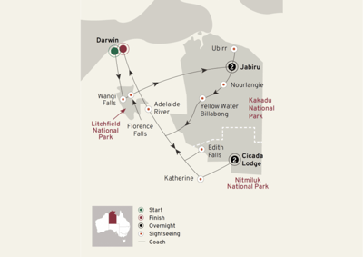 Welcome to Darwin! This morning meet your Journey Director and board your luxury vehicle to begin your journey of discovery in the Top End. Travel across the Finniss River to Litchfield National Park. You'll visit tumbling Florence Falls and you'll also enjoy a swim to cool off at Wangi Falls, surrounded by tropical monsoon rainforest and hear about its importance in Aboriginal custom before stopping for lunch. Get ready for a cross-country journey into the magnificent Kakadu National Park. Keep your eyes open for Crocodiles as you cross the South Alligator River, Brolgas, Magpie Geese and Jabiru as you traverse along the long grasses of the marshes and wetlands. Kakadu really is a diverse UNESCO world heritage site.