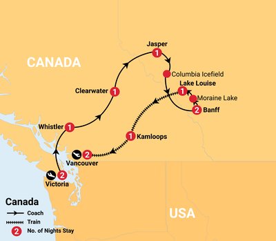 This journey uses a Private Coach for part of your tour and a scenic rail journey on the Rocky Mountaineer.. For coach journeys, where applicable there will be comfort stops along the way where you can freshen up, stretch your legs, use the bathroom and often, purchase refreshments. Generally, lunch stops will be taken at rest stops as they can easily accommodate our large groups.