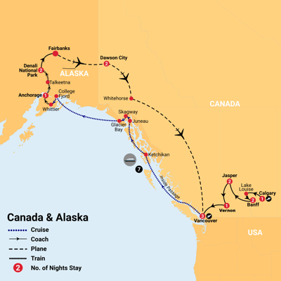 ✓ Incredible sightseeing including Rocky Mountain snow-capped peaks, cruise the Inside Passage to Alaska and Denali National Park and finish in the Yukon.