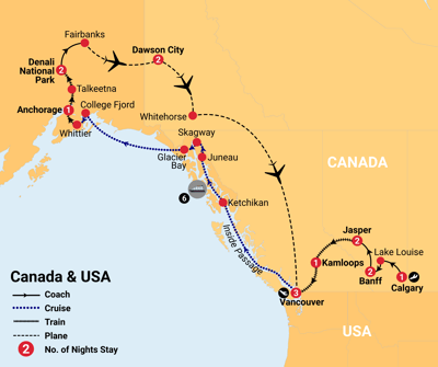 ✓ Incredible sightseeing including Rocky Mountain snow-capped peaks, cruise the Inside Passage to Alaska and Denali National Park and finish in the Yukon.