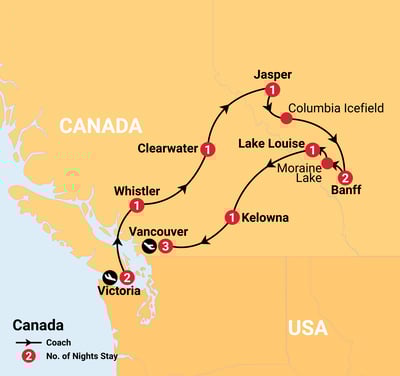 This unforgettable journey through Western Canada reveals the beauty of Victoria’s gardens, Whistler’s alpine charm, and the glacial wonders of Jasper and Banff. Experience iconic mountain passes, dramatic canyons, turquoise lakes, and breathtaking alpine scenery, balanced with vibrant coastal cities and relaxed Pacific charm.