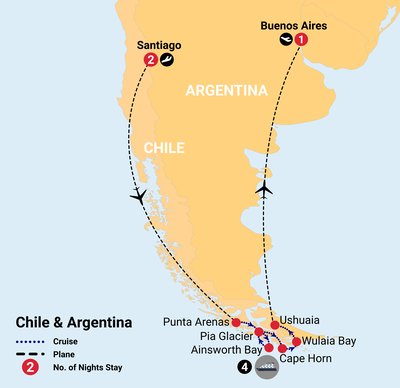 ✓ Internal flights Santiago to Punta Arenas and Ushuaia to Buenos Aires