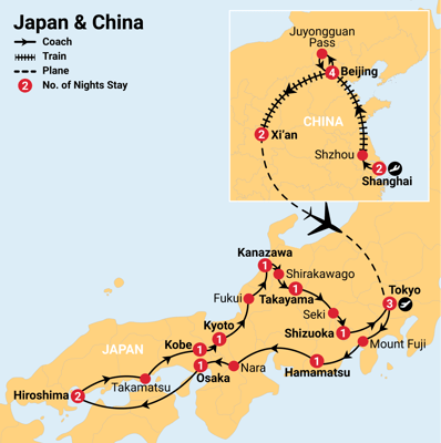 Discover China’s rich history, from Shanghai’s skyline and Suzhou’s classical gardens to Beijing’s Forbidden City, the Great Wall and Xi’an’s Terracotta Warriors. Then embark on to a Japan adventure, exploring Tokyo’s temples, Mount Fuji, Kyoto’s shrines, Hiroshima’s Peace Park, traditional villages, and vibrant markets.