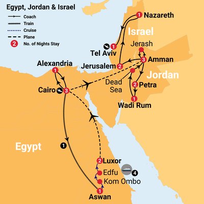This tour uses private coaches, internal Domestic flights, an overnight train, cruise, and an international flight from Cairo to Amman. For coach journeys, where applicable there will be comfort stops along the way where you can freshen up, stretch your legs, use the bathroom and often, purchase refreshments. Generally, lunch stops will be taken at rest stops as they can easily accommodate our large groups.