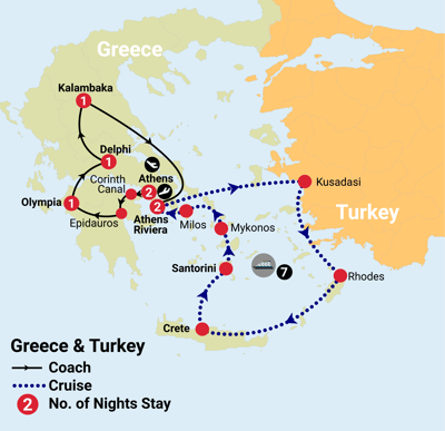 ✓ Transportation including dedicated coach on the mainland and transfer from Athens hotel to cruise port