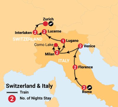 Below are the approximate train journey durations for key travel segments included in this itinerary. All travel is by comfortable, pre-booked rail services—mainly high-speed trains in Italy and scenic regional or panoramic trains in Switzerland.
