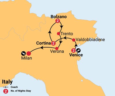This tour takes you through some of Italy's most iconic regions, from the ancient streets of Venice to the breathtaking landscapes of the Dolomites and the picturesque lakes of northern Italy. Travel will primarily be by private coach, with scenic drives offering stunning views of Italy’s countryside and mountain ranges. Comfort stops will be made along the way for stretching your legs, using facilities, and purchasing refreshments.