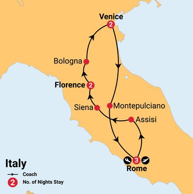 This tour covers Italy’s most iconic cities and destinations, travelling by deluxe coach with several scenic journeys along the way. Comfort stops will be made throughout the coach rides where you can freshen up, stretch your legs, use the bathroom, and purchase refreshments. Lunch breaks will typically be at rest stops, offering convenient spots for group dining.