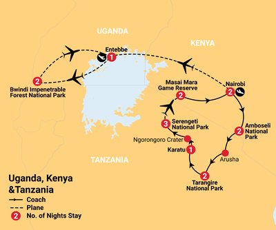 ✓ Internal flights from Serengeti National Park to Masai Mara Game Reserve, Nairobi to Entebbe and Entebbe to Bwindi National Park return