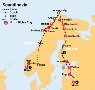 Embark on an unforgettable journey through the Baltics and Scandinavia, exploring Vilnius, Riga, and Tallinn before venturing into Finland and Norway. Travel independently with premium intercity buses, then join a small group for a seamless adventure. Experience the breathtaking Norway in a Nutshell journey, stunning fjords, and the magical northern lights—all effortlessly arranged.
