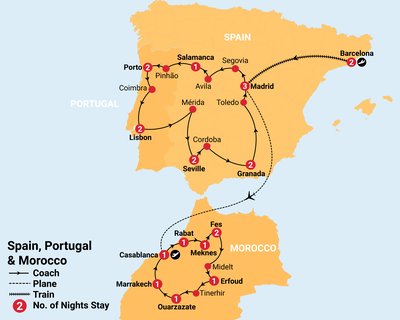 This tour covers Spain, Portugal and Morocco using a private coach, and plane between Spain and Morocco. For some coach journeys, where applicable there will be comfort stops along the way where you can freshen up, stretch your legs, use the bathroom and often, purchase refreshments. Generally, lunch stops will be taken at rest stops as they can easily accommodate our large groups.