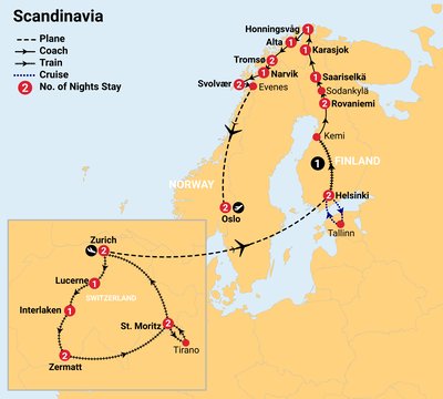 Experience the magic of winter in Europe with a unique journey combining an independent Swiss rail adventure and a fully guided tour through the snowy wonders of Norway and Finland. Glide through the Swiss Alps by scenic trains, discover the Lofoten Islands, enjoy husky sledding, spend a night in a glass igloo, and ride the Santa Claus Express.