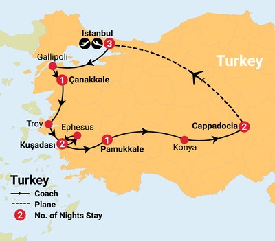 Explore Turkey’s cultural and historical wonders over 10 unforgettable days on this Private Tour: discover Istanbul’s iconic landmarks, reflect at the Gallipoli Battlefields, and explore ancient sites like Troy, Pergamon, and Ephesus. Marvel at Pamukkale’s white terraces, visit Konya on the Silk Road, and experience the magic of Cappadocia.