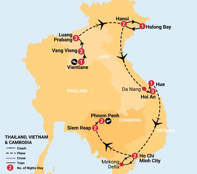 ✓ Airfares from Luang Prabang to Hanoi, Hanoi to Danang, Hue to Ho Chi Minh City & Ho Chi Minh City to Siem Reap