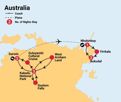 Whilst accommodation on days 6, 7 & 8 could be one of the highlights of your trip, it is important that you know that it is provided at a Yolŋu Homeland. Your hosts will provide the best they have however, facilities are simple and on shared basis. Depending on the Homeland, accommodation may be provided at a fixed structure or at a large canvas tent; and bedding will be available on low beds or comfortable camping beds. Bathroom facilites are also simple and are similar to what you can expect at well maintained national parks within Australia. If requested, our resevervations team can provide images of what accommodation looks like in this remote part of Australia.
