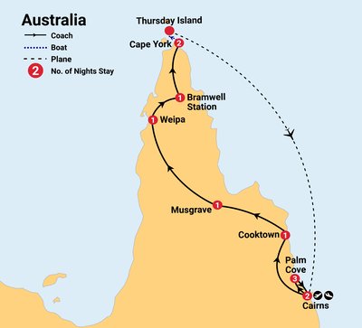 An early morning departure as you cruise through island studded straits to explore our northern community, Thursday Island. Here you will be taken on an informative guided bus tour of the island and its picturesque Harbour, once home to the romantic pearl lugger fleet. Then board your plane at Horn Island for your flight back to Cairns. Arriving late afternoon in Cairns your tour finishes with a drop off at your hotel.