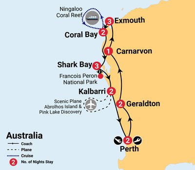 ✓ Incredible sightseeing including a full day marine snorkeling tour in Ningaloo Reef, full day 4WD to Francois Peron National Park, scenic flight to Pink Lake and Abrolhos Island including landing and play time at East Wallabi Island