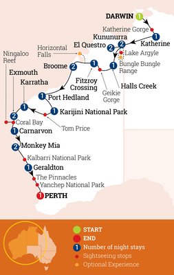 Venture through Kalbarri National Park and visit Hawks Head Lookout to view the spectacular scenery of Murchison River Gorge. Keep an eye out for graceful Peregrine Falcons hunting along the gorges and cliffs. During wildflower season, the National Park is a bloom with many a variety of wildflower. You'll spot Acacia, Banksia, Caladenia and more! On arrival in Geraldton you'll visit the evocative HMAS Sydney Memorial and have the chance to discover the seaside township.