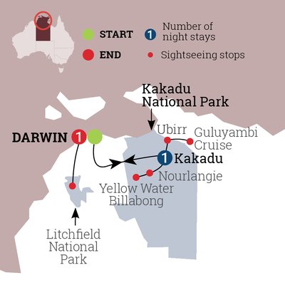 Depart Darwin and travel along the Arnhem Highway, their major river systems and wetlands, into Kakadu National Park. Located 257 kilometres east of Darwin, this national park covers 20,000 square kilometres of landscape from rocky escarpment home to historic Aboriginal rock art dating back thousands of years, to floodplains abundant with wildlife.