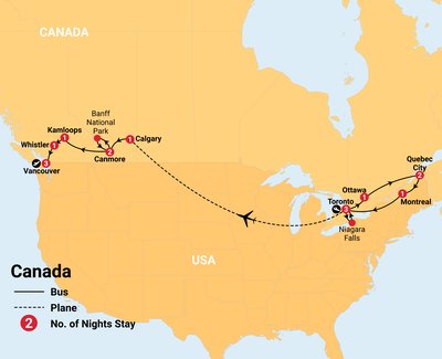 ✓ Incredible sightseeing including Toronto's famous landmarks, witness the beauty and power of the Niagara Falls, discover Quebec's French-speaking cities, Banff National Parks snow-capped peaks, sparkling glaciers and emerald green lakes, and explore the cosmopolitan cities of Vancouver and Calgary