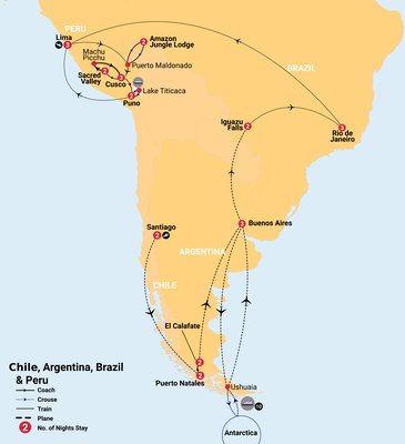 ✓ Independent touring in Patagonia with local guides, and fully escorted by local expert guides in each country from Days 18 - 37 (excluding internal flights)