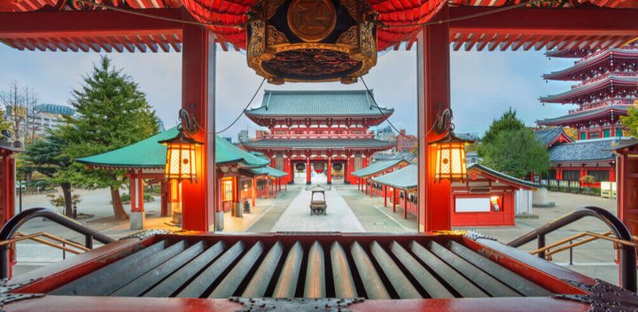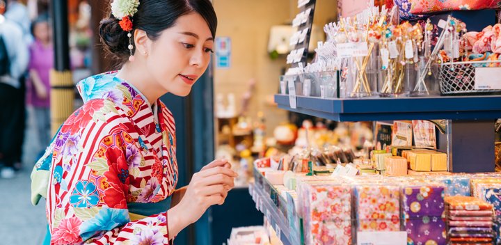 Next we visit Asakusa district, and the Sensō-ji Temple. This is Tokyo’s oldest temple, and it's dedicated to Kannon, the Buddhist goddess of mercy. On the approach to Sensō-ji is Nakamise Shopping Street, a centuries-old promenade of shops selling traditional snacks and souvenirs like kimonos and bottles of saké.