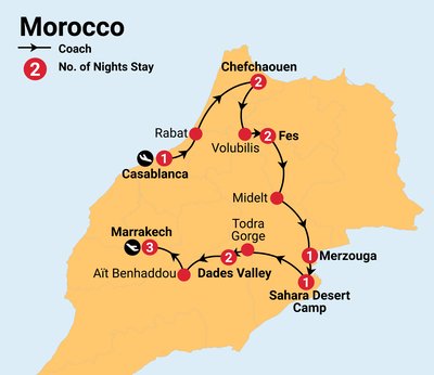 While in Morocco, you will travel by private coach. This journey spans a vast and varied landscape, providing the perfect opportunity to sit back, relax, and enjoy the scenic views. Please review the itinerary for estimated travel times.