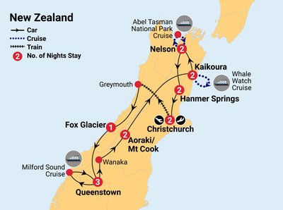 ✓ Incredible sightseeing, cruise along the golden beaches of Abel Tasman National Park, whale watching cruise off the coast of Kaikoura, free time to hike in Mt Cook National Park, cruise spectacular Milford Sound, visit New Zealand’s famous glaciers and national parks and travel on the TranzAlpine, one of New Zealand's most picturesque train rides