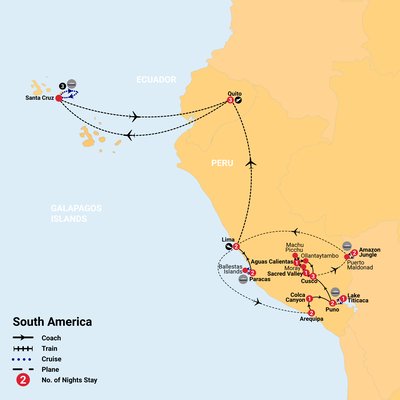 An epic South American adventure awaits: ride the scenic train to Machu Picchu, explore Lima, enjoy a two night stay in the Amazon and cruise in luxury while taking in the best that the Galapagos has to offer. Homestays at Lake Titicaca, hot springs in Colca Canyon, and tours of the Sacred Valley and Taquile Islands will ensure you have memories for years to come.