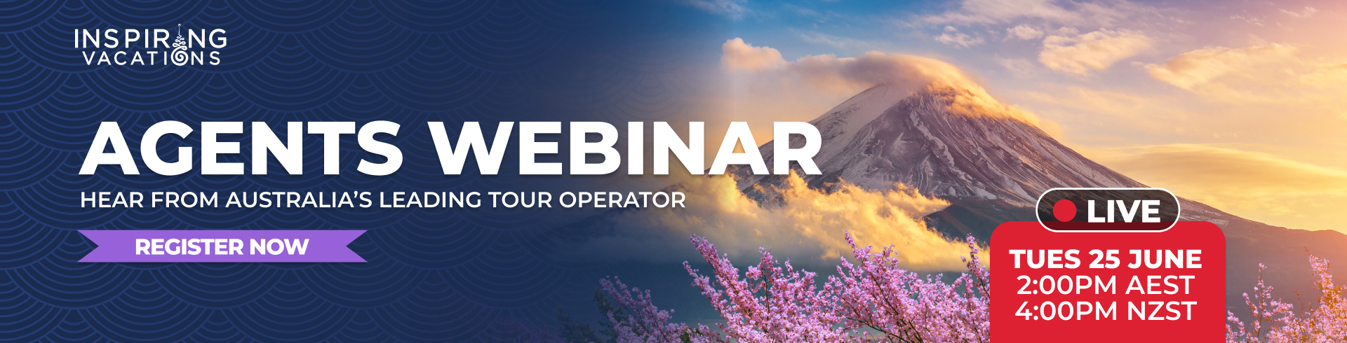 Join us at 4:00pm (NZST), Tues 25 June and learn about what Inspiring Vacations has to offer. This is your chance to connect, learn, ask your questions and grow in the travel industry.