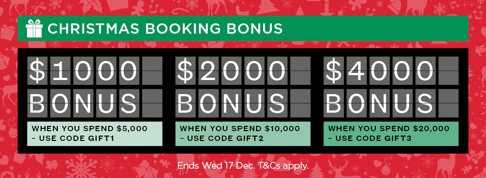 Get money off your current booking, plus a future travel voucher worth up to $1,500 with our exclusive Christmas Booking Bonus.