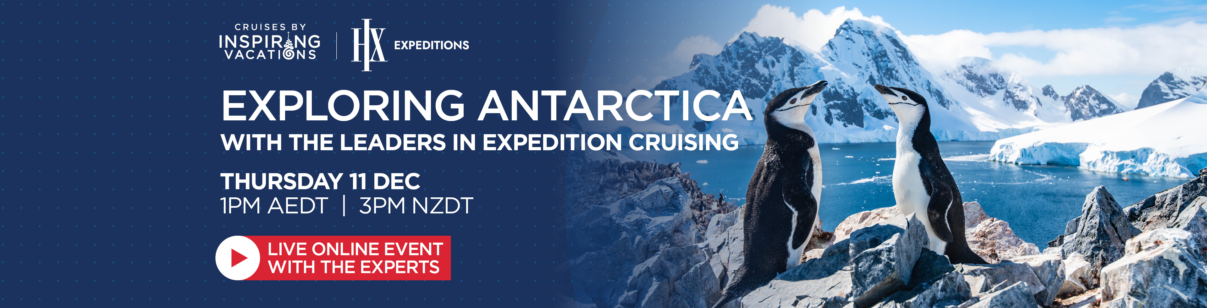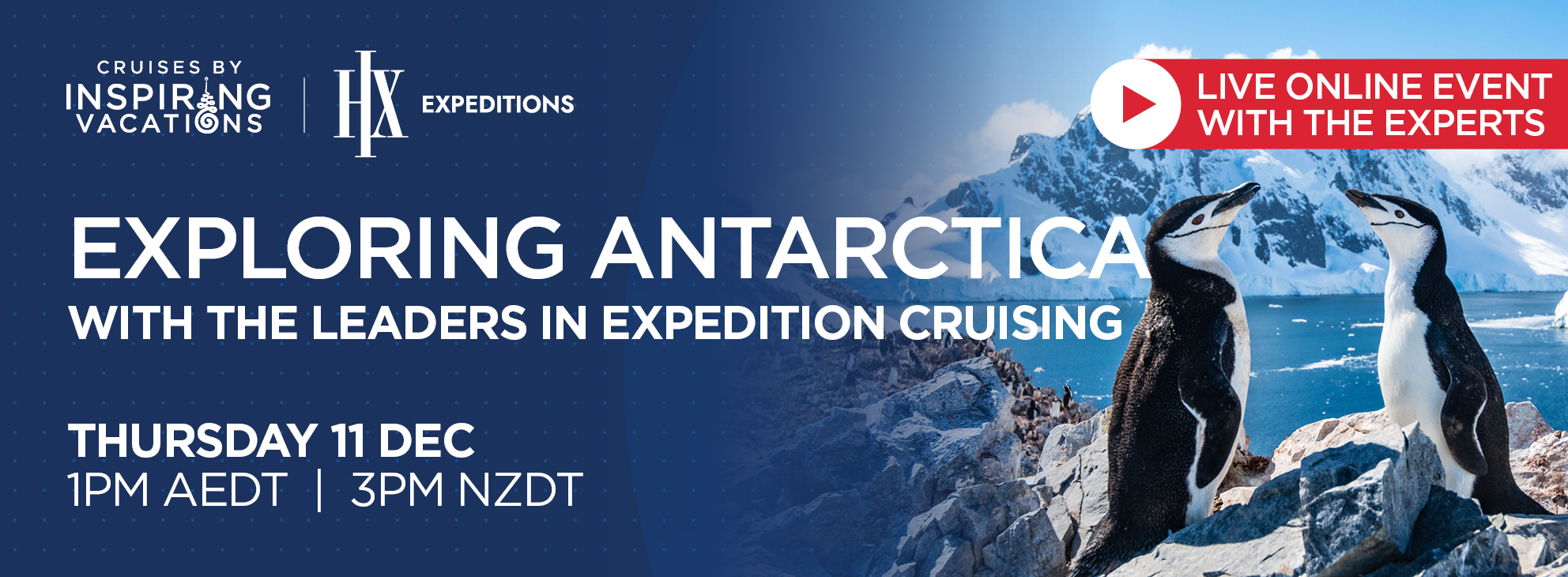 In this exclusive live online event, travel experts from Inspiring Vacations and HX Expeditions will walk you through everything you need to know about travelling to Antarctica with Inspiring Vacations and HX Expeditions.