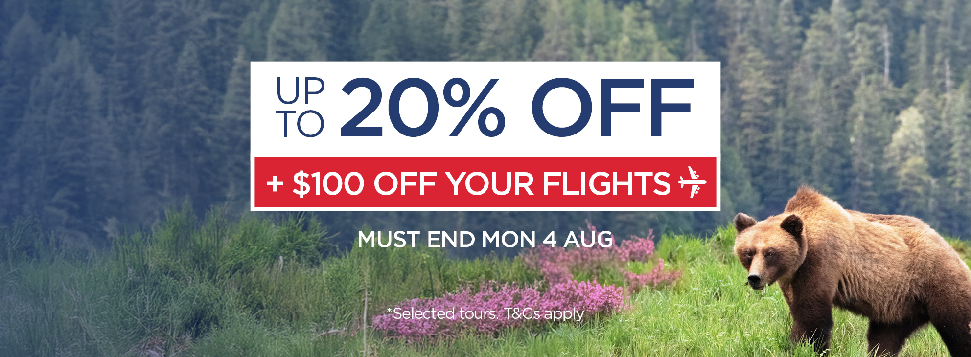 Book a selected tour by Mon 4 August and save up to 20%, plus receive a bonus $100 per person flight credit voucher to put towards your flights.