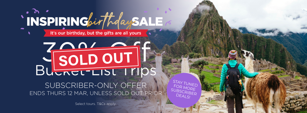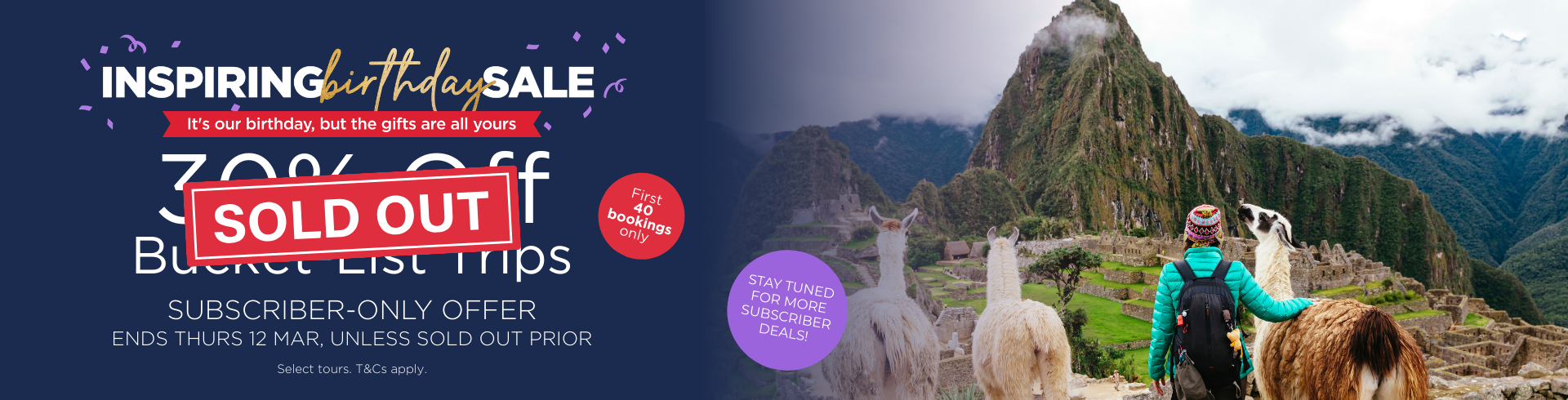 Be inspired with the latest subscriber-only deal taking 30% off some of our most-loved inspiring destinations. Limited to 40 bookings only. This offer is now sold out - stay tuned for more subscriber-only deals!