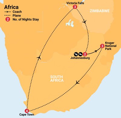 ✓ Internal flights Kruger to Cape Town, Cape Town to Victoria Falls and Victoria Falls to Johannesburg
