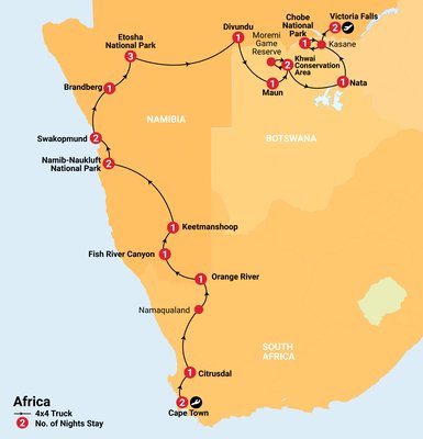This camping adventure takes you through the breathtaking landscapes of Southern Africa, from the vibrant streets of Cape Town to the towering dunes of Namibia and the wildlife-rich plains of Botswana. Experience epic safaris, cultural encounters, and the awe-inspiring Victoria Falls on this unforgettable journey through diverse and spectacular terrain.