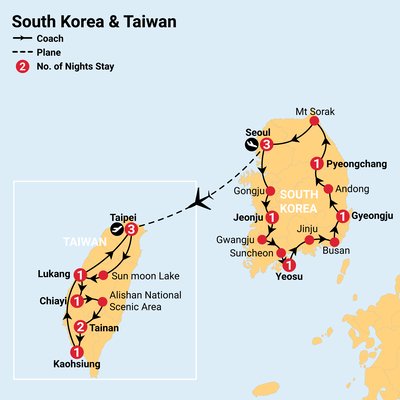 Between South Korea and Taiwan, you will travel by flight from Seoul (Incheon) to Taipei.