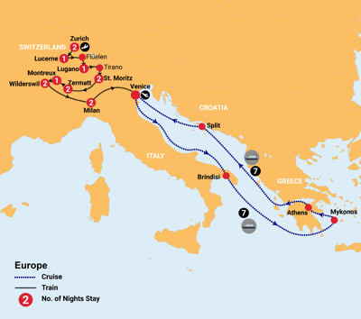✓ Incredible sightseeing! Tour Switzerland by world-famous rail journeys, experience the alpine wonderland of Jungfraujoch – Europe’s highest railway station, explore the incredible sights of Italy’s Northern Lakes, and look forward to breathtaking Greece and Croatia on a luxurious Mediterranean cruise