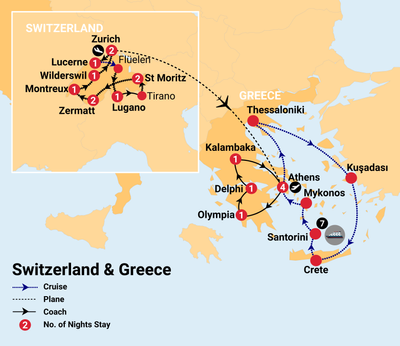 ✓ Enjoy the flexibility of independent travel with all arrangements made for you in Switzerland, a fully escorted land tour in Greece and time to relax on an 8 day cruise of Greece and Turkey